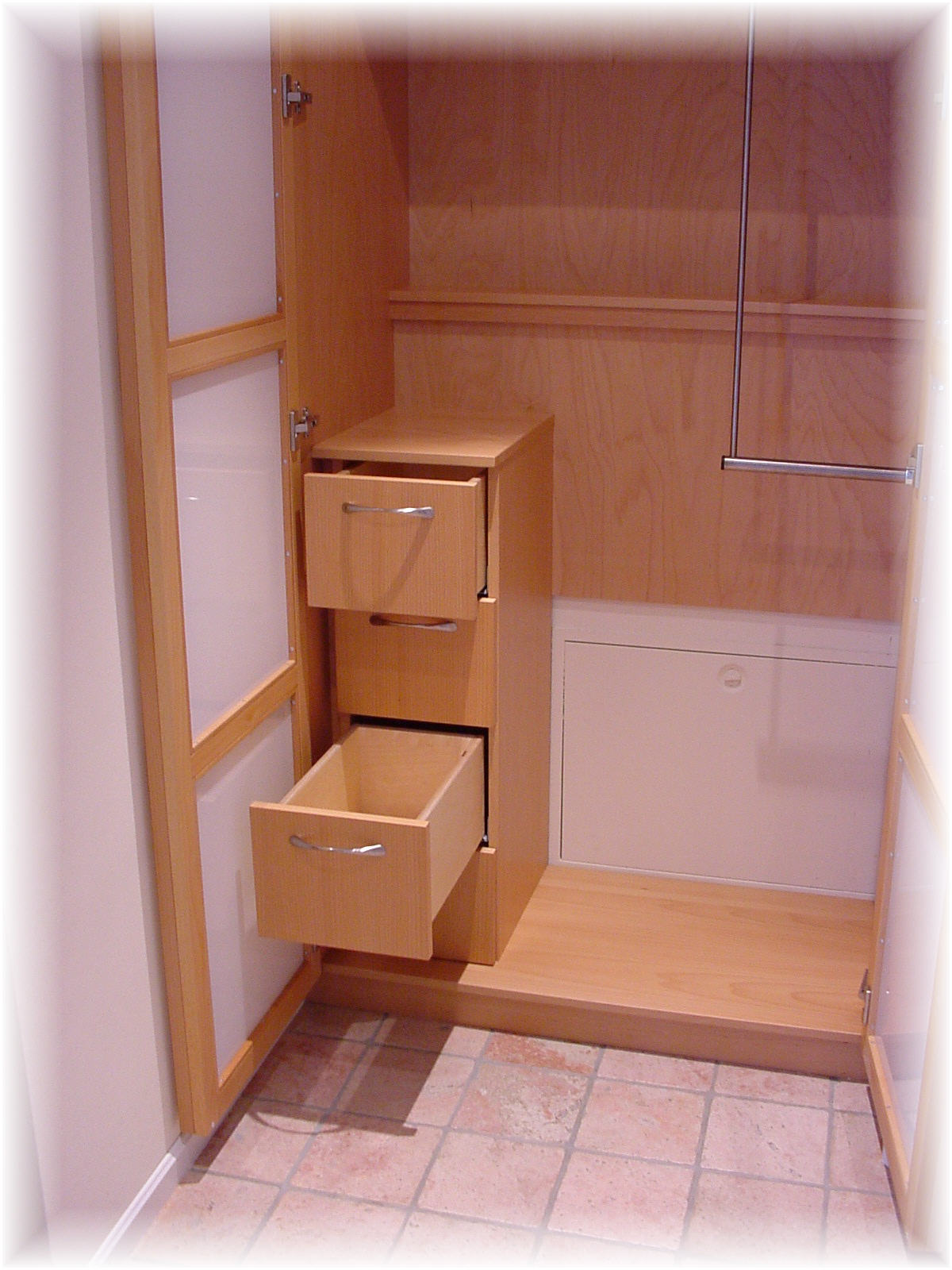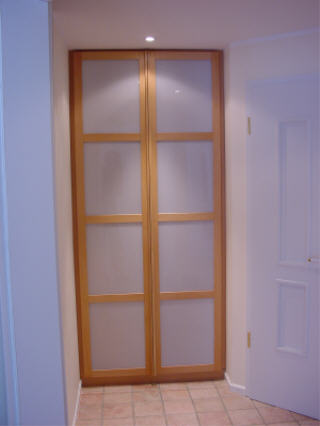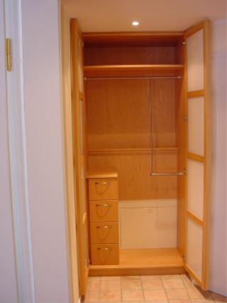 Garderobenelement aus Buche mit Griffleiste und Milchüberfangglas. Hier finden Mäntel und Jacken Ihren Platz. Durch die Sonderlösung der Kleiderstange ist der Zugriff selbst für Kinder einfach