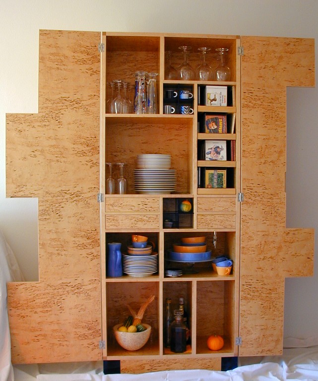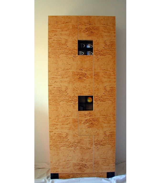 Die Türen dieses Schrankes öffnen sich versetzt. Geschlossen bilden sie eine glatte Oberfläche und erzeugen den Eindruck zweier zentraler Öffnungen.