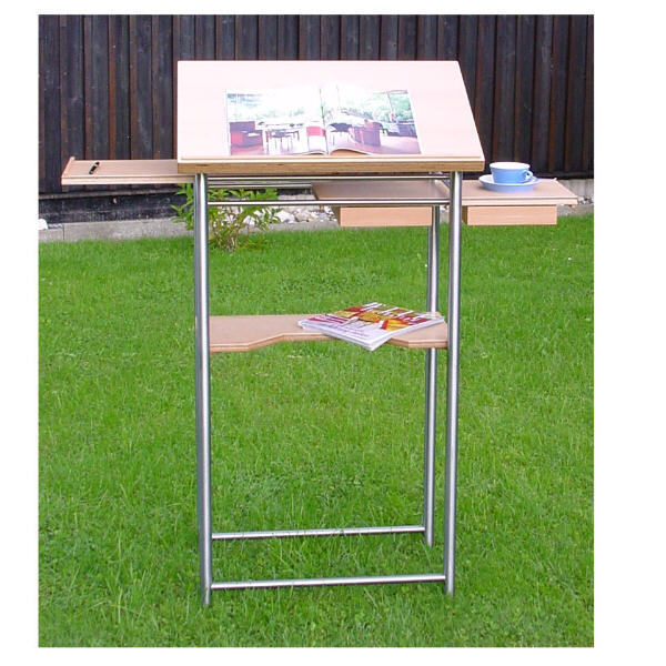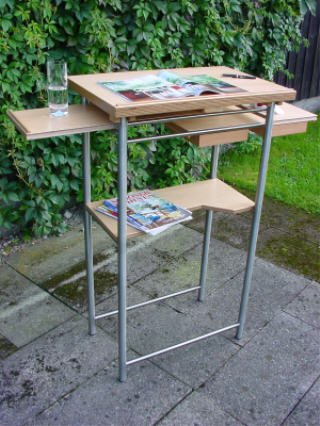 Ein Stehpult, das keine Wünsche offen lässt. Die Pultplatte ist in der Neigung stufenlos verstellbar. Genügend Ablagefläche           beidseitig. Aufbewahrung für Kleinutensilien in Schüben.