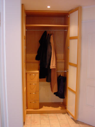 Garderobenelement aus Buche mit Griffleiste und Milchüberzugsglas. Hier finden Mäntel und Jacken Ihren Platz. Durch die Sonderlösung der Kleiderstange ist der Zugriff selbst für Kinder einfach.